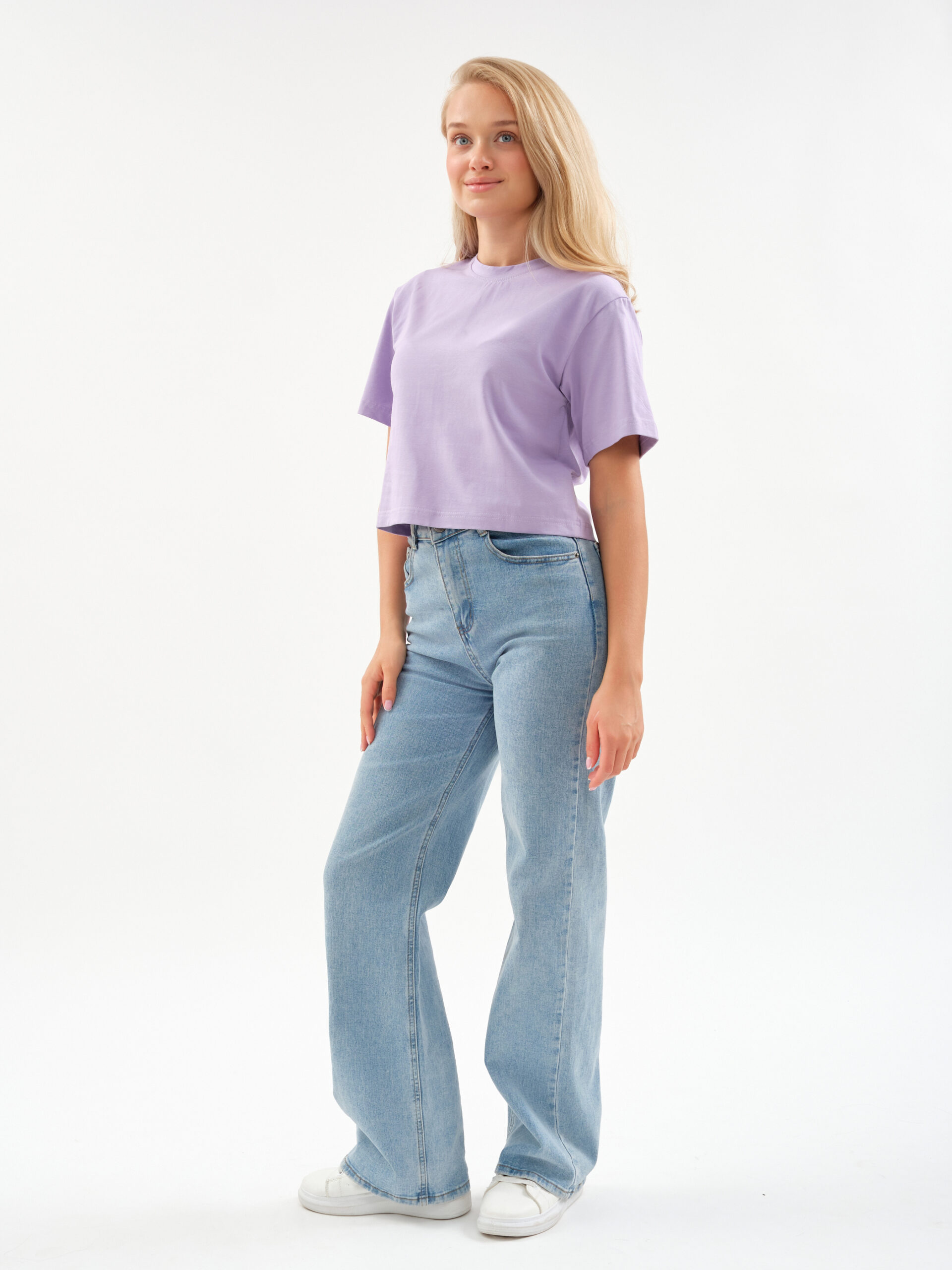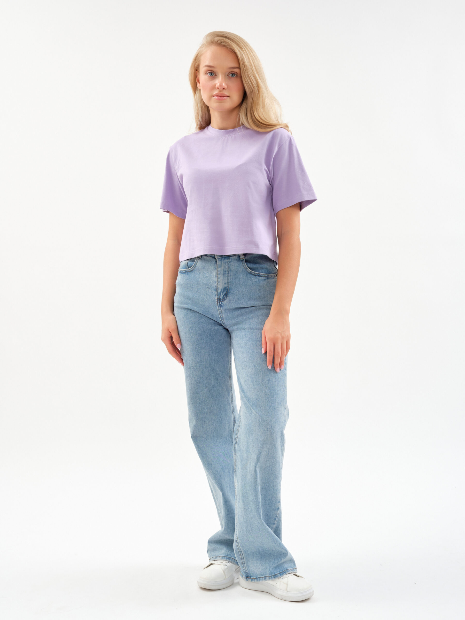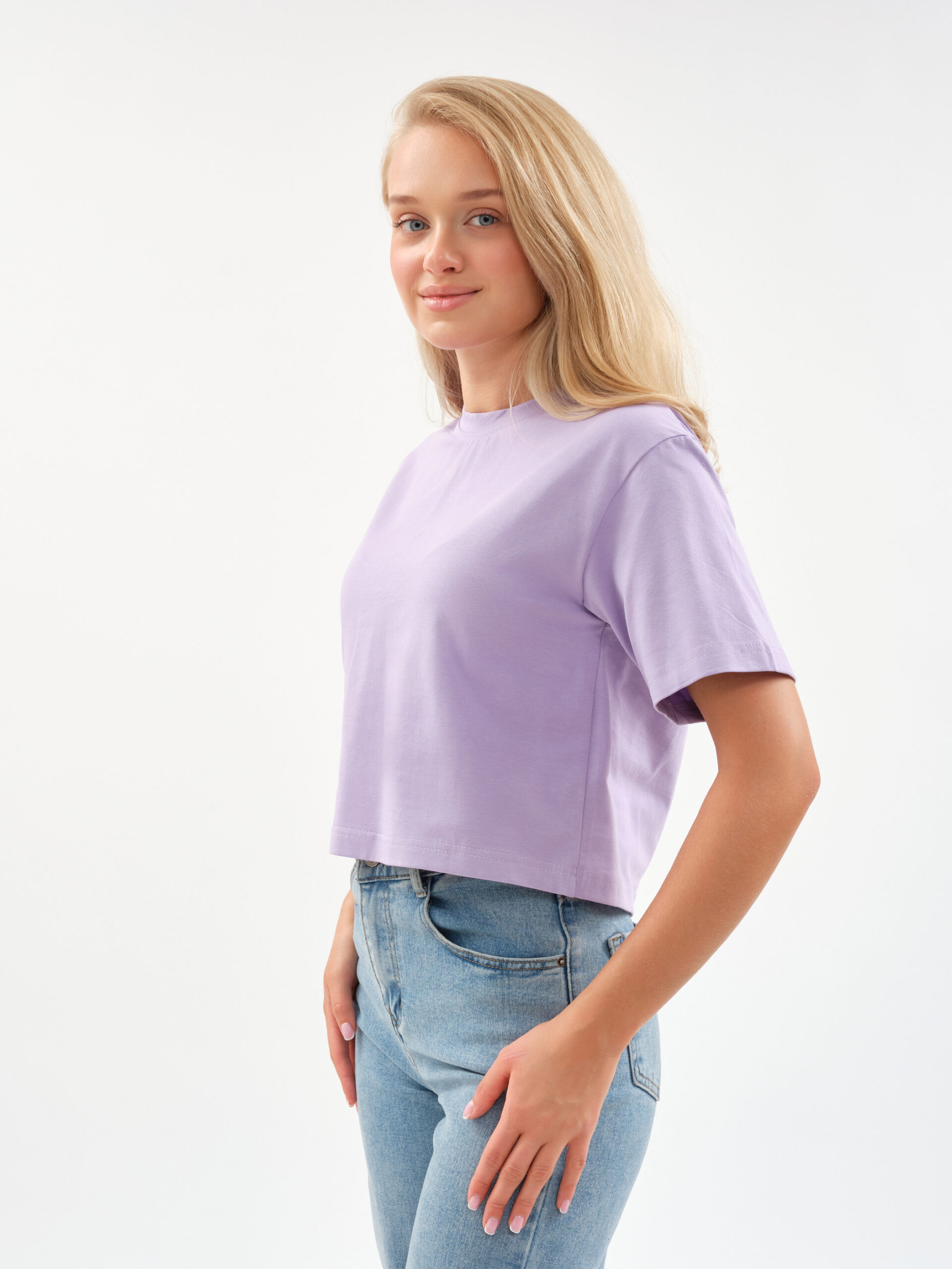 Укороченная длина и современный силуэт позволяют легко сочетать футболку с легинсами на высокой посадке, джинсами или спортивными шортами.