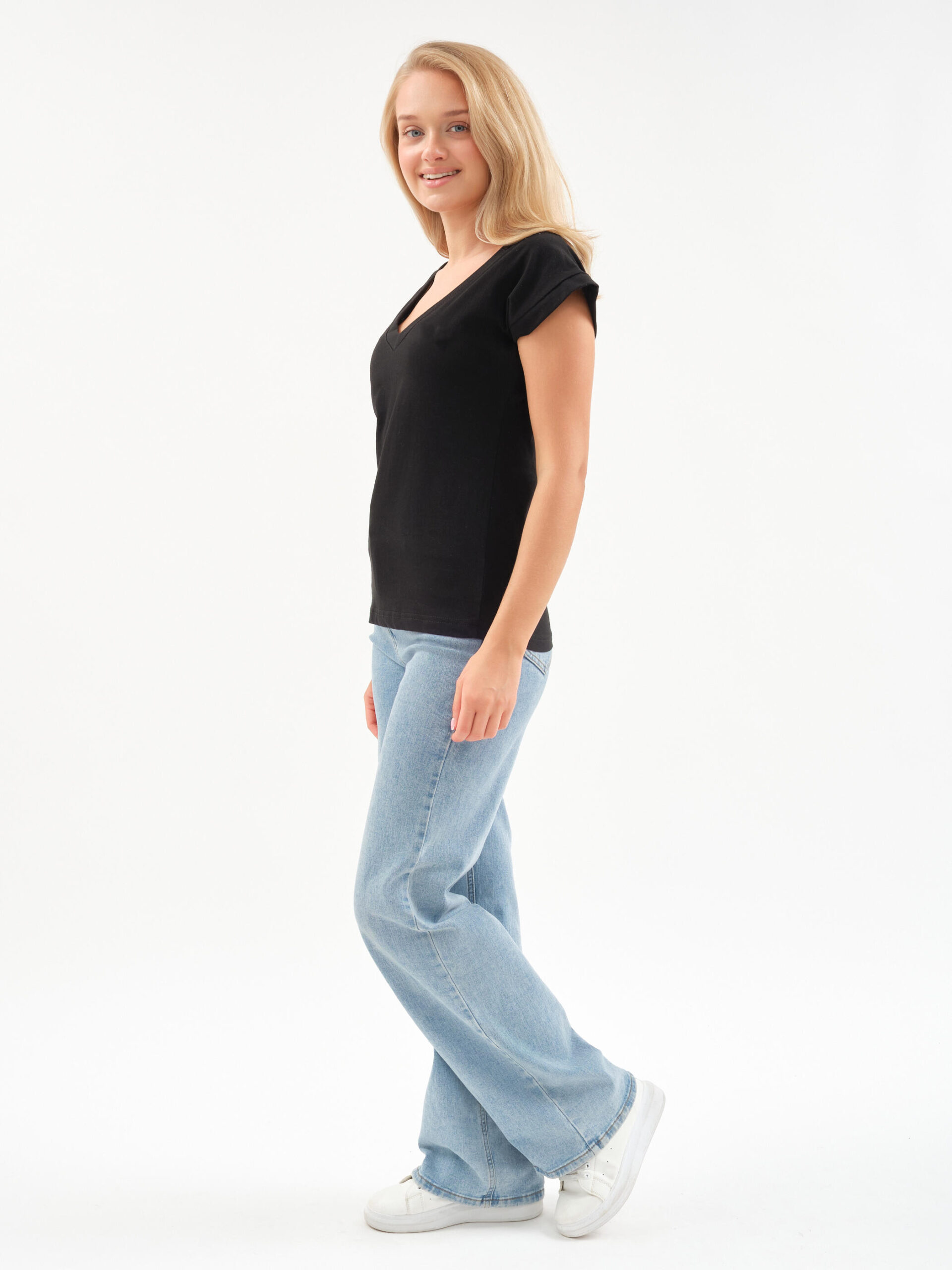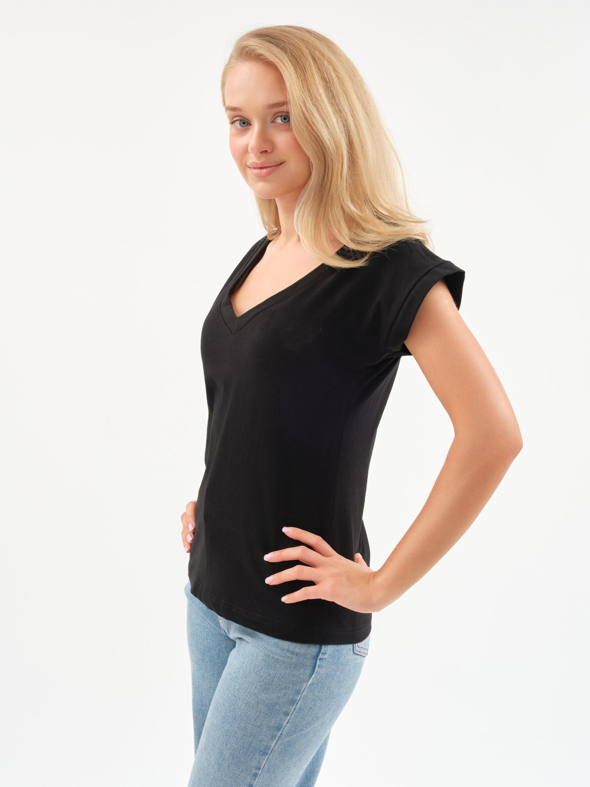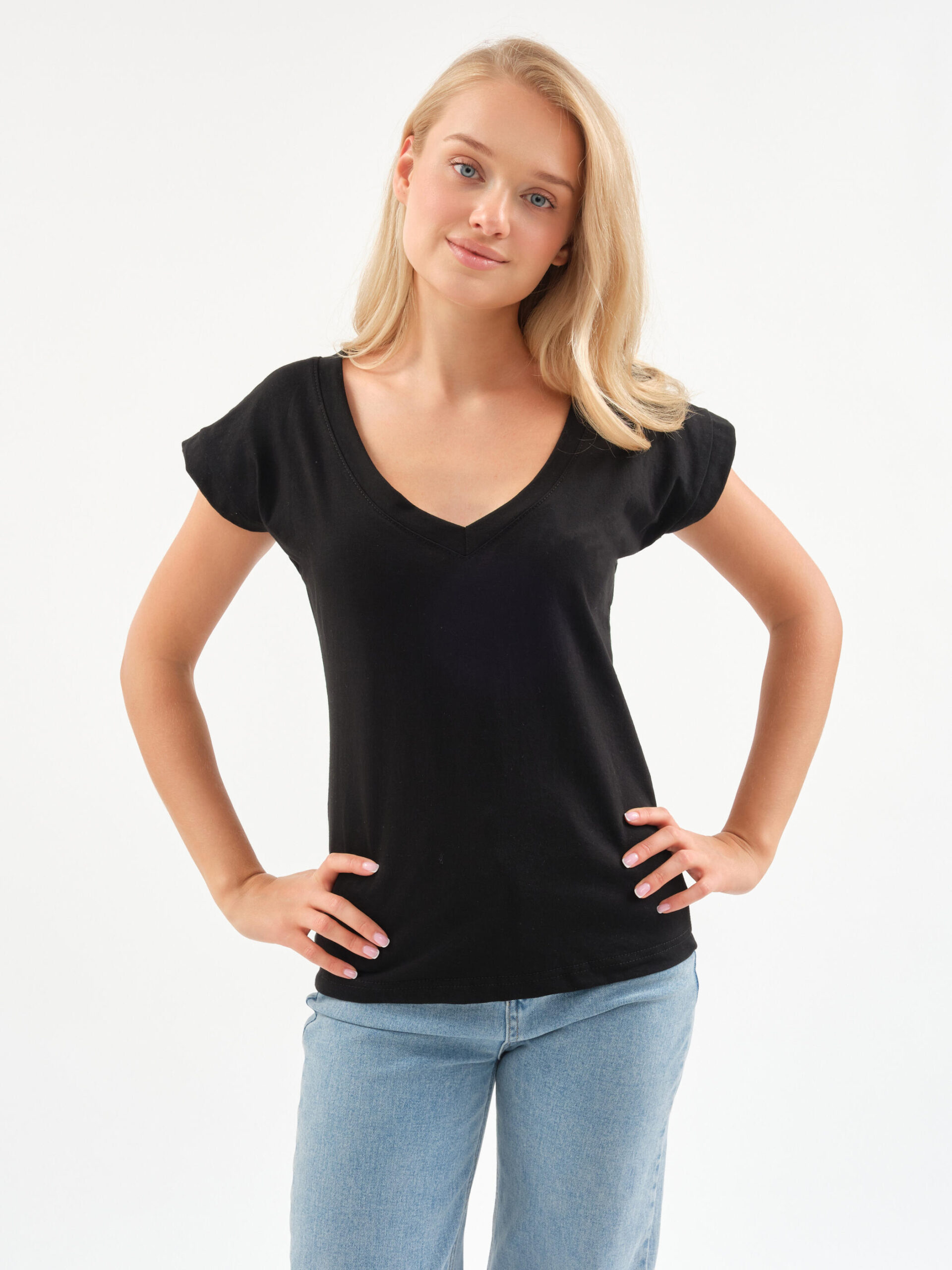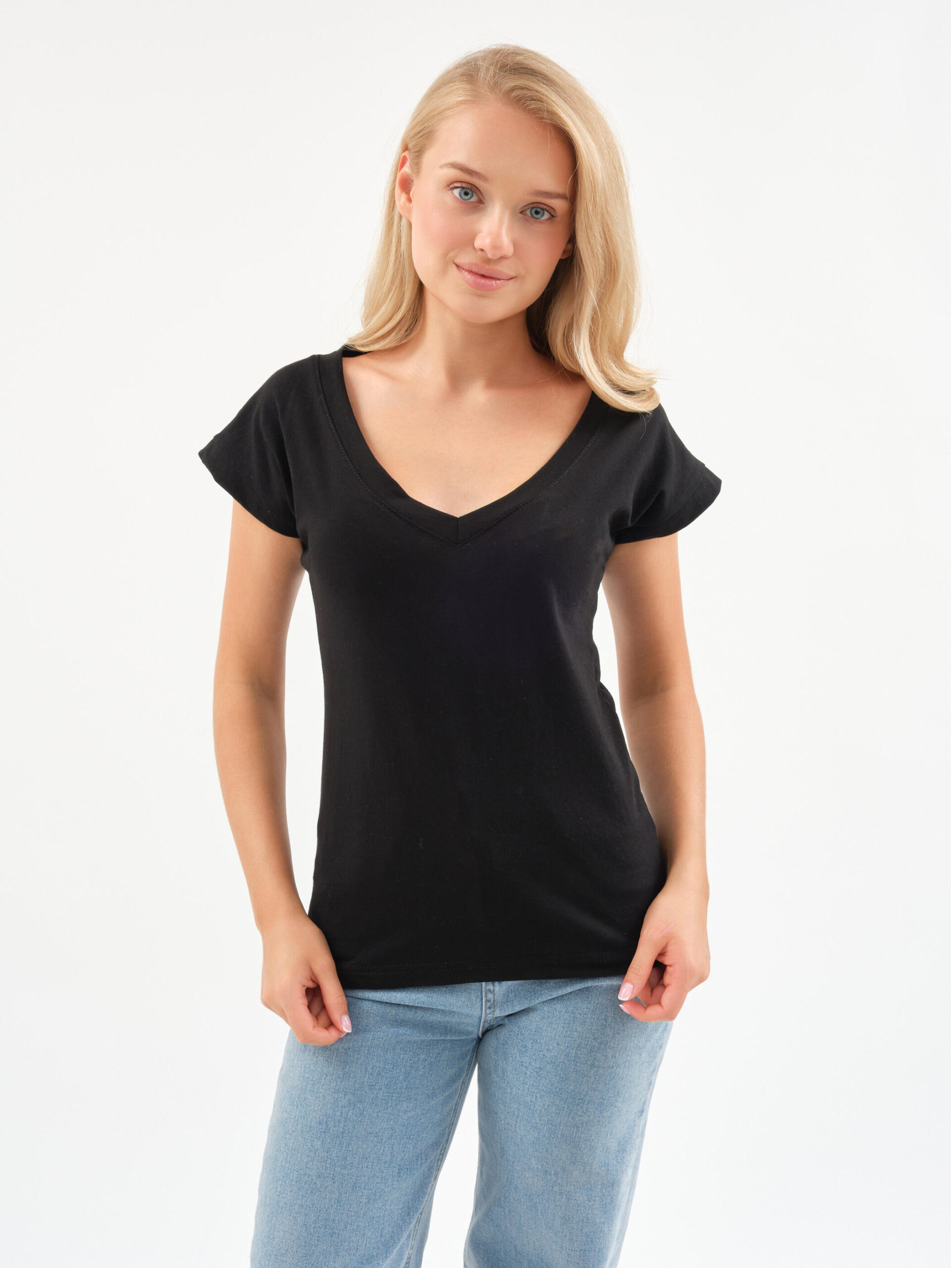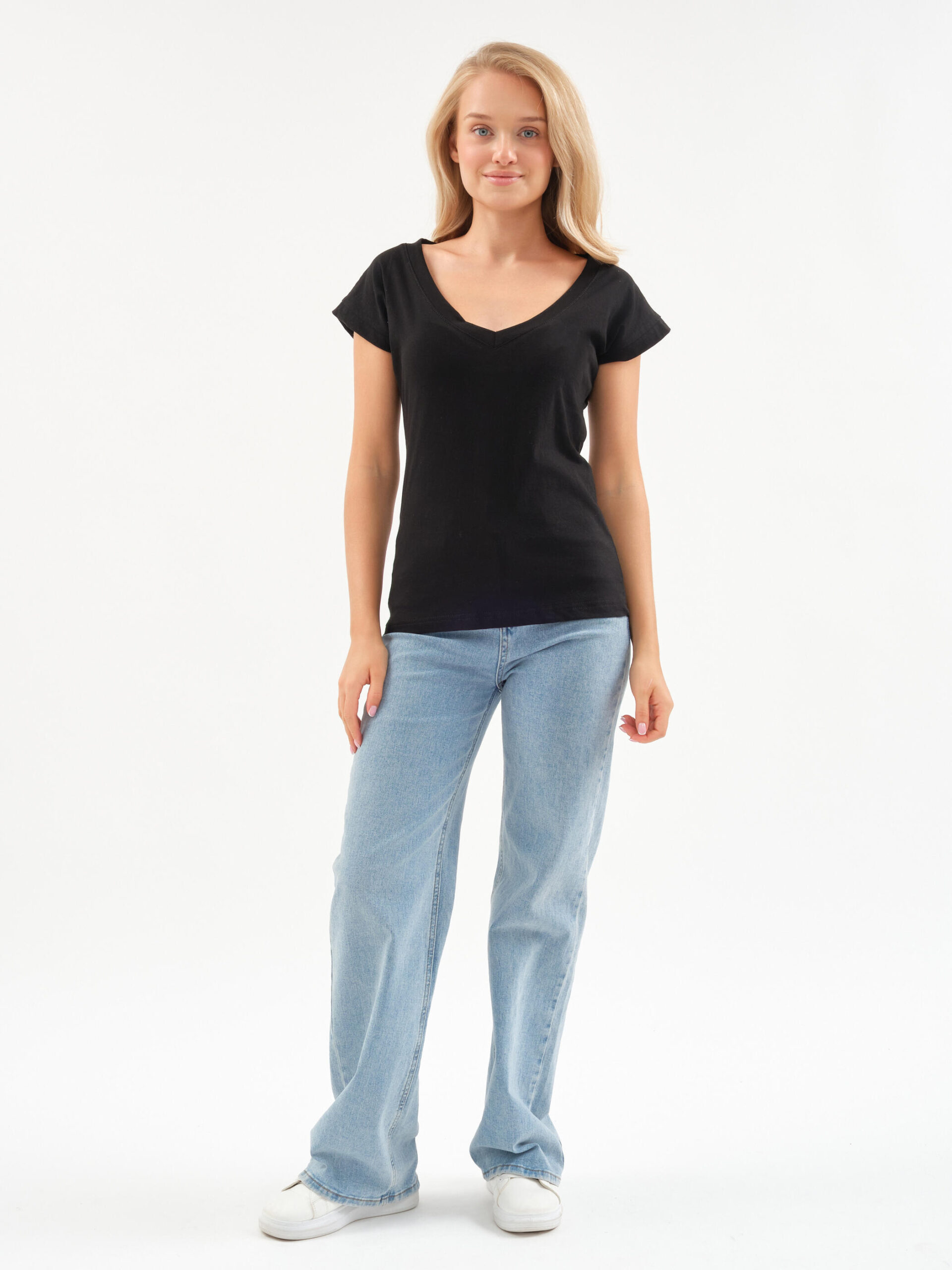 Чувствуйте себя уверенно и легко! Эта футболка — тот самый случай, когда комфорт встречается с элегантностью. Глубокий V-образный вырез добавляет нотку женственности в повседневный образ, а мягкий хлопок нежно обволакивает кожу.