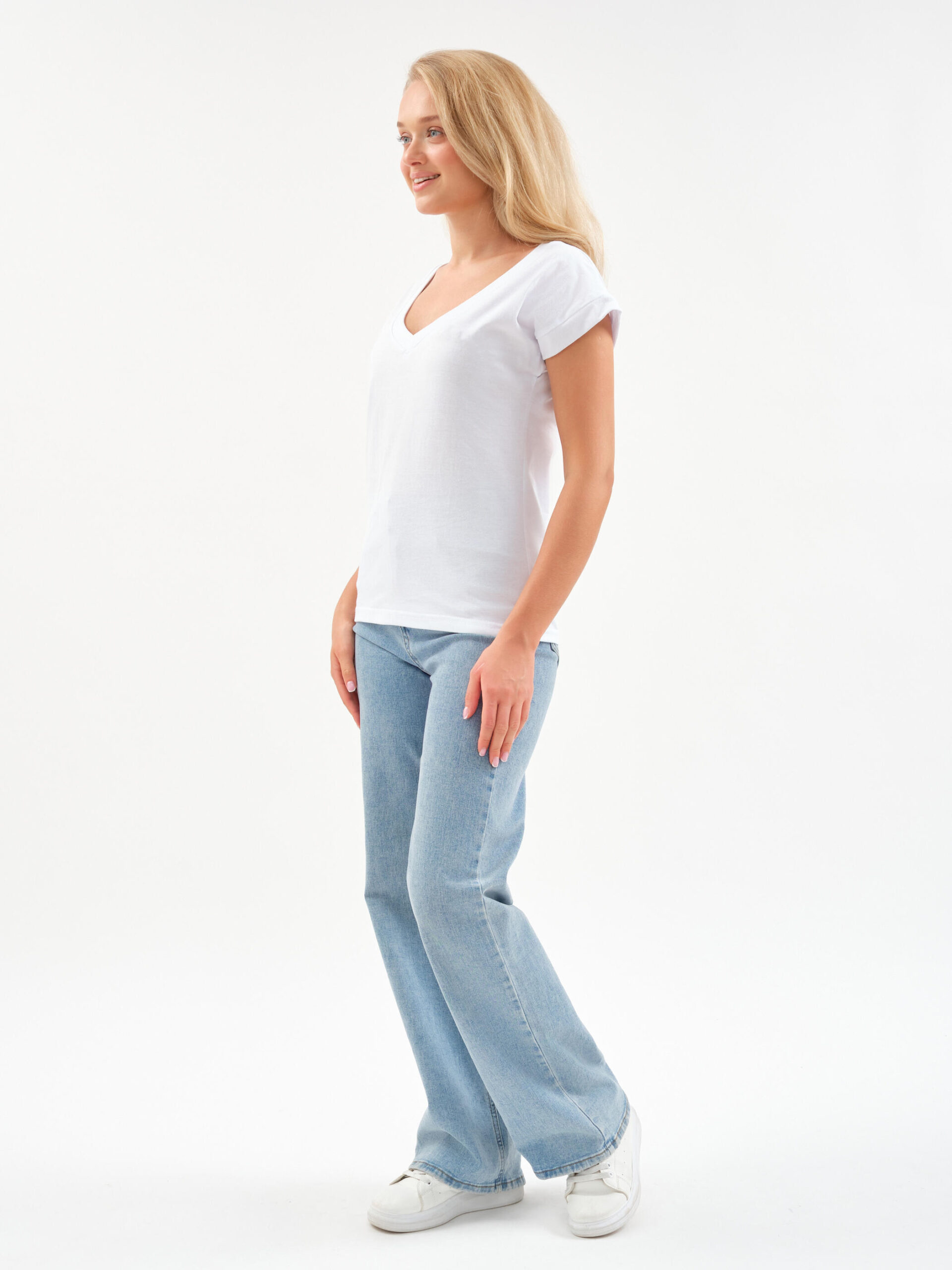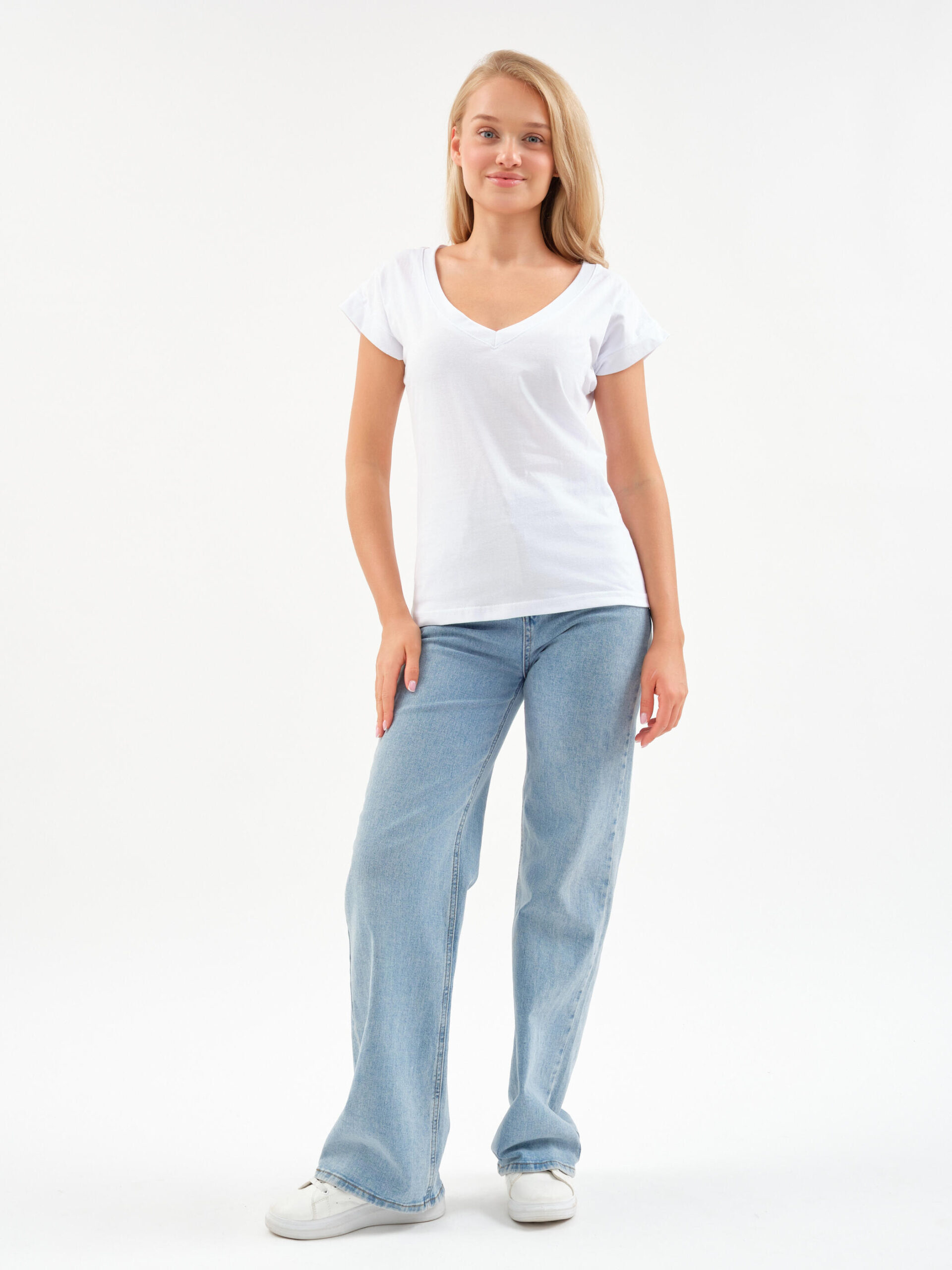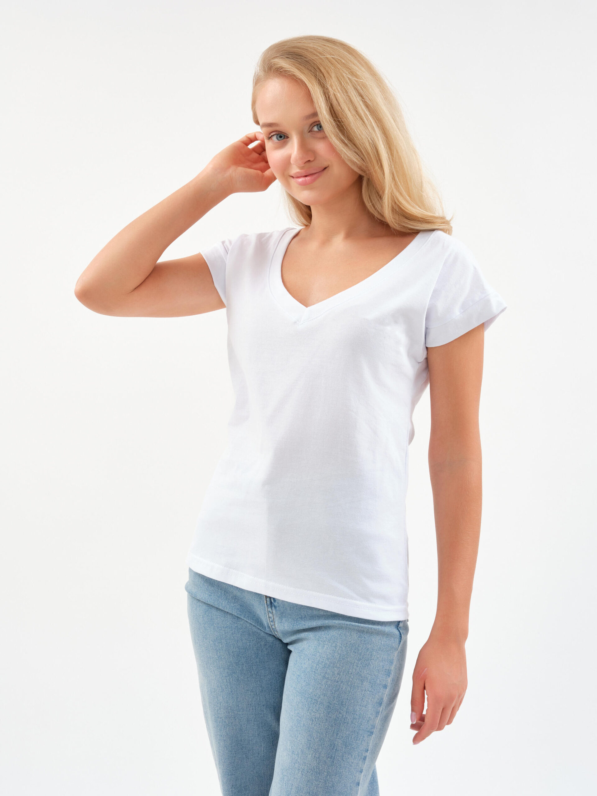 Чувствуйте себя уверенно и легко! Эта футболка — тот самый случай, когда комфорт встречается с элегантностью. Глубокий V-образный вырез добавляет нотку женственности в повседневный образ, а мягкий хлопок нежно обволакивает кожу.